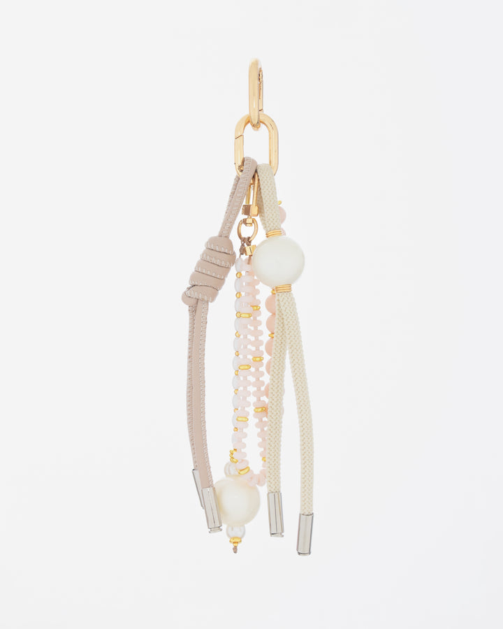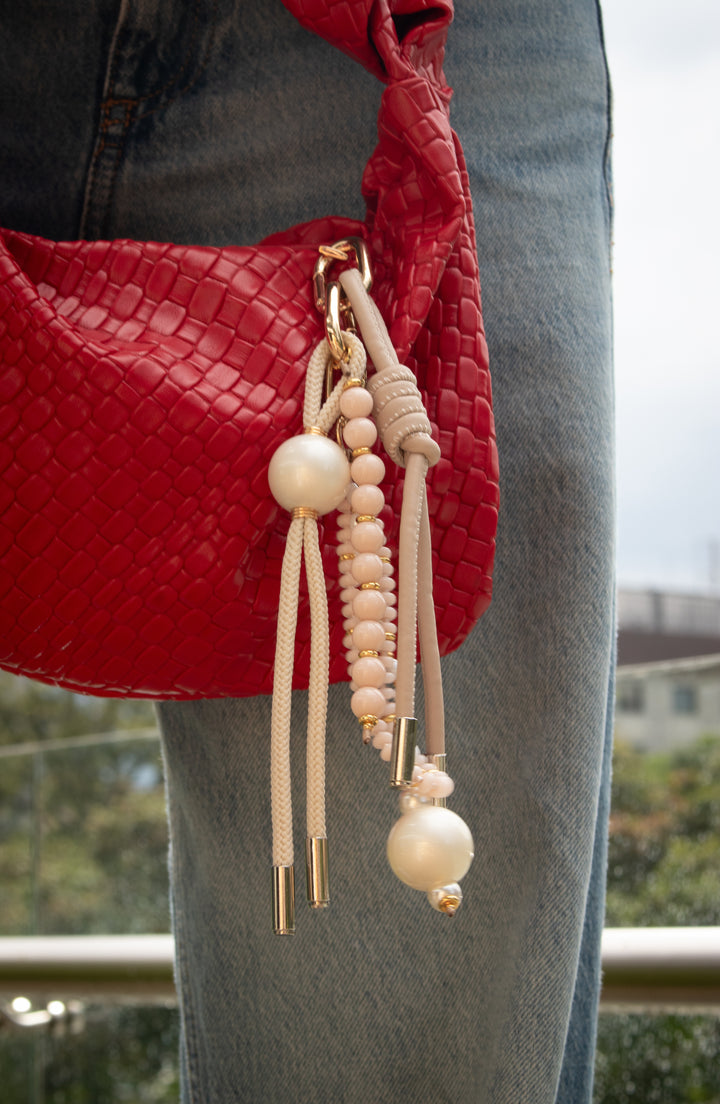- Bagcharm elaborado con perlas blancas grandes, piedras mandala nude y detalles en vidrio beige perlado.
